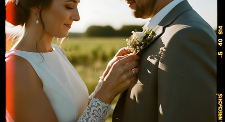 A bride in a white dress gently adjusts the boutonniere on the groom's gray suit, set against a serene green field with trees in the background at sunset.