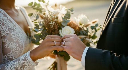 Close-up of a bride and groom's hands showing their wedding rings, with the bride holding a bouquet and standing in front of a sunset, wearing a white dress and the groom in a black suit.