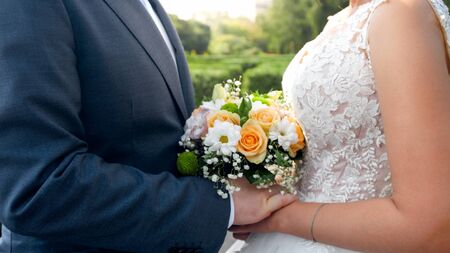 Closeup photo of young bride and groom holding together beautiful bridal flower bouquet