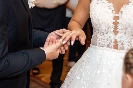 The groom or husband puts the ring on the bride or wife of the wedding ceremony. Wedding event.