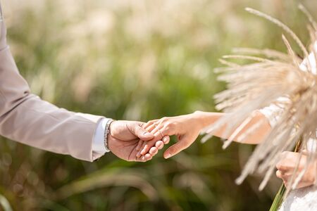 Closeup photo of bride and groom hands touching grass on the field. Weeding ceremony in nature