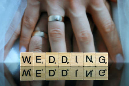 WROCLAW, POLAND - FEBRUARY 28, 2020: The word WEDDING made of scrabble letters, and hands of the bride and groom showing wedding rings in the background. Studio shot.