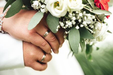 Hands of groom and bride with rings and a beautiful wedding bouquet