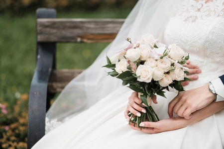 The bride and groom sit and gently stroke their hands to each other. Closeup of hands and wedding bouquet