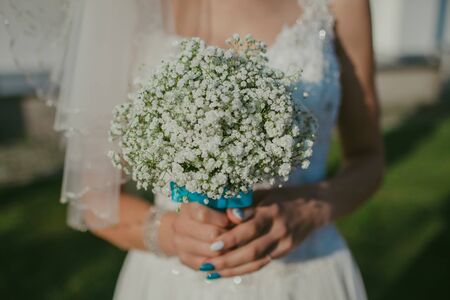 Bouquet for the bride in the hands of the grooms close-up on the background of the sky, fresh flowers for the bouquet.