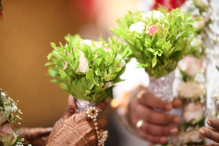 Hands of bride and groom with rings on wedding bouquet. Marriage concept