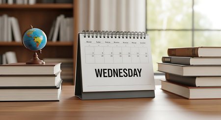A calendar on a wooden desk showing Wednesday, flanked by piles of books and a small globe, in a well-lit room.