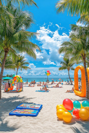 A beach-themed background with summer elements such as palm trees, sunbathers, and sea life in a cartoon style. The design includes playful decorations like balloons and board games on the sand, framed by an open space for text or branding elements. A blue sky above is filled with clouds, and small boats are floating on the water. This illustration would be suitable for advertising or promotional materials related to a vacation spot or summer activities. --ar 2:3 --v 6.1 Job ID: 7ef97e95-440d-4c63-b60e-c2547d4602f9