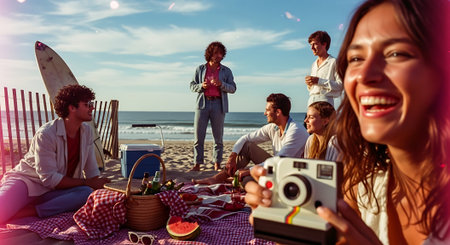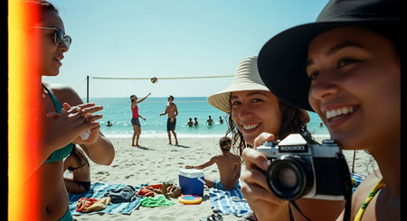 Group of friends having fun on the beach. They are taking pictures of themselves.