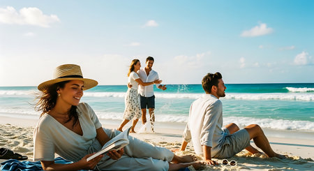 Cheerful young woman in straw hat sitting on the beach with friends and reading book