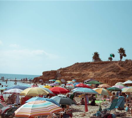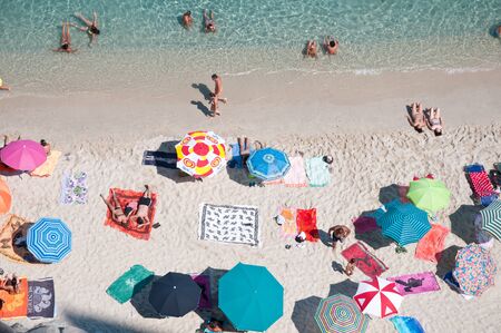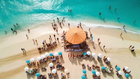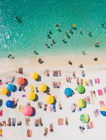 A birdseye view of a sandy beach adorned with colorful umbrellas, people enjoying the sun and water, against a backdrop of a vast blue sky AIG50