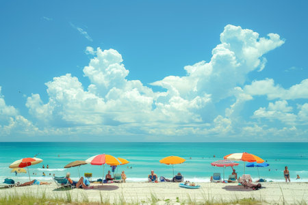 Visitors bask under the sun on a beautiful Miami beach, surrounded by turquoise waters and colorful beach chairs in a lively atmosphere.