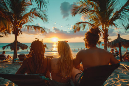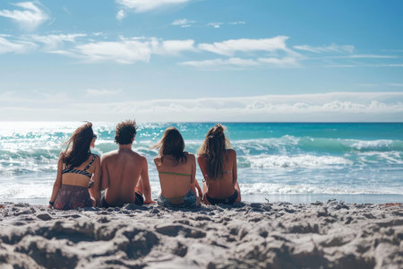 Three friends relax on the sandy beach, gazing out at the vast ocean on a sunny day, Friends enjoying a sunny day at the beach