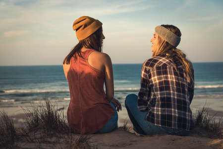 Woman photographing fashionable friend in hat on the sandy beach, using to take a photo camera of a smartphone. Summer vibes. Tourist. Travelers. Relax.