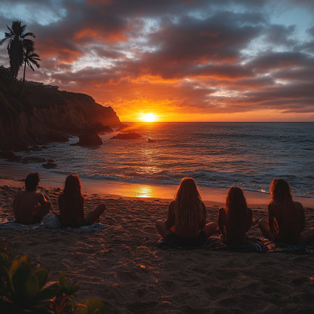 A group of individuals gather on a sandy beach, observing a vibrant sunset. The composition displays various colors including shades of orange, yellow, and blue. The scene evokes a sense of togetherness and possibly leisure. This image could be used for lifestyle, travel, or editorial content.
