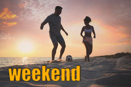 hello weekend. Happy couple playing football on sandy beach at sunset