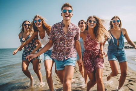Enjoying freedom Group of young cheerful people running along the beach and looking happy : Generative AI