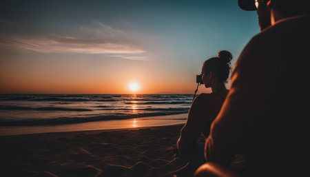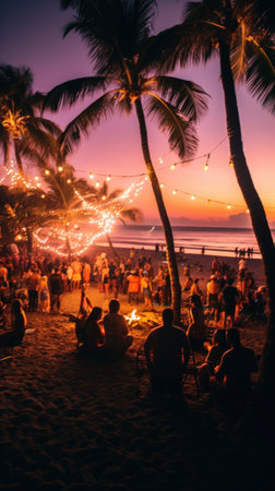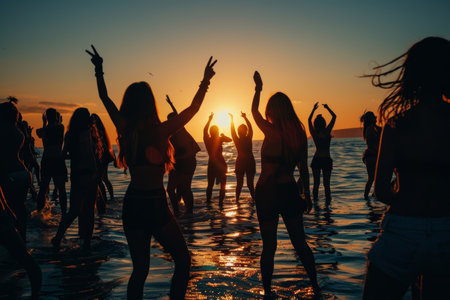 Silhouettes sway in a vibrant sunset at a tropical beach dance party, epitomizing summer joy