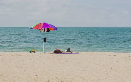 Babylon, New York, USA - 14 July 2019: Horizontal view of a crowded Robert Moses State Park Ocean Beach with people sitting in chairs and colorful umbrellas providing shade.