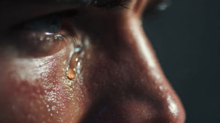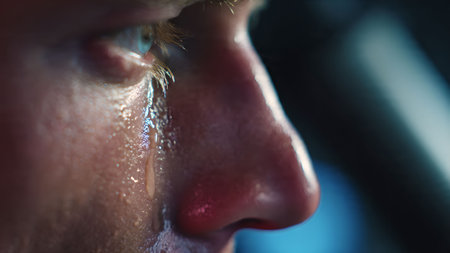 A close-up portrait capturing a man in deep sorrow, with tears on his face. This image evokes emotion, showcasing vulnerability and the raw experience of distress in a poignant moment.