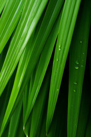 A close-up view of vibrant green grass blades adorned with sparkling water droplets, capturing the essence of freshness and natural beauty in nature.