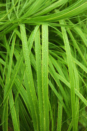 Rain-soaked ornamental grass Fine green blades of ornamental grass are speckled with rain droplets. The lines and curves create a textured, flowing visual rhythm.
