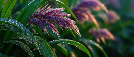 Morning sunlight glistens on dew covered purple grass in a vibrant field showcasing natures beauty and tranquility at dawn.