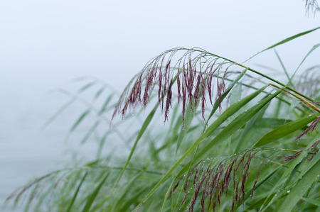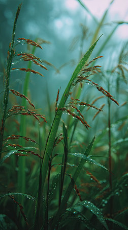 The Wild rice in light fog, dew on leaves, light soft diffused, threequarter view.