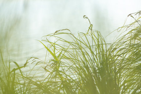 Green grass on the shore of lake at sunset. Beautiful summer landscape. Selective focus
