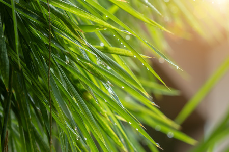 green fresh grass with drops of morning water dew after rain, nature background with raindrop, backdrop leaf plant closeup, flora macro concept with the shine rays of the sun