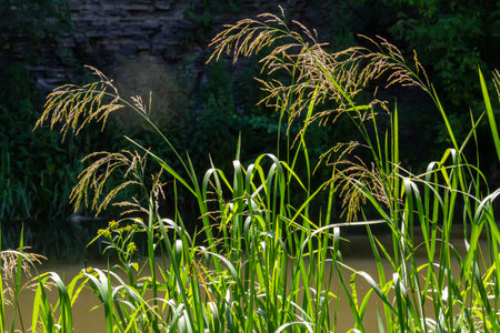On the banks of the river and in the water, the forage grain Glyceria maxima grows.
