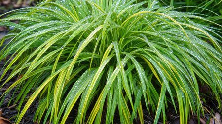 This image showcases a vibrant green grass-like plant with water droplets glistening on its leaves, embodying freshness and beauty in a natural garden environment.
