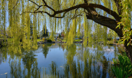 A Serene Spring Day Captured: The Gentle Sway of a Willow's Green Tendrils in the Breeze