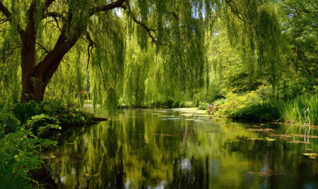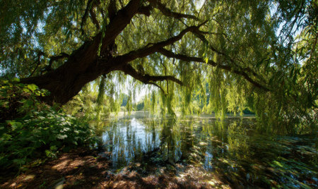A majestic weeping willow tree bathed in morning sunlight. Peaceful and serene nature photography.