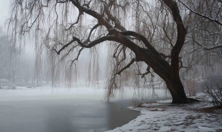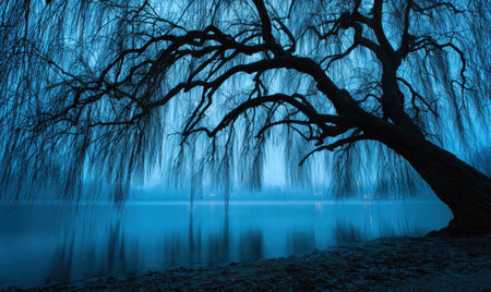 A willow tree with its long, trailing branches creates a graceful and peaceful background with plenty of copy space.