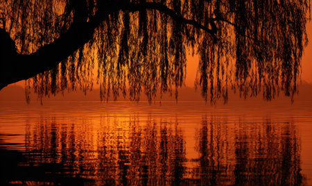 Rain-soaked willow branches dripping water, reflecting the warm hues of sunset, tranquil riverbank generative ai