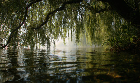 Weeping Willow Leaves Hanging Over Water Natural Green Foliage Background Peaceful Scene