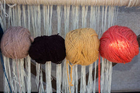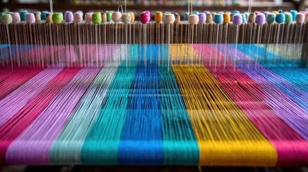 Close-up view of a vibrant weaving loom showcasing an array of colorful threads in various shades, highlighting the intricate artistry and craftsmanship involved in textile production. Perfect for showcasing traditional techniques in a modern light.