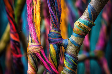 A close-up of intertwined tree branches, each covered in colorful silk threads that flow like water, creating an ethereal and vibrant tapestry of nature's artistry. The background is blurred to emphasize the intricate details of coloration on the thorns. --ar 3:2 --v 6.1 Job ID: 328ae700-d7e9-4e71-a9ee-af71e06d6146