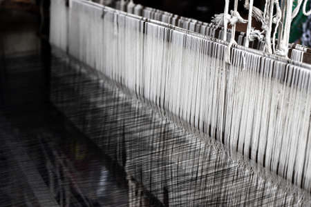 Close Up green and white yarn on the loom. Native cotton weaving using a Loom of weaving, which is folk wisdom, showing the ingenuity in creating Thai art.