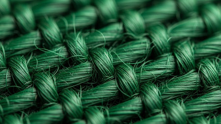 An extreme close-up macro shot revealing the intricate woven texture of a coarse green fabric. Thick, robust threads are interlaced to create a distinct pattern, showcasing the structure and tactile The deep green color is rich and earthy, highlighting the natural or synthetic fibers used. This detailed view emphasizes the physicality of the textile, backgrounds, or illustrating concepts related to and craftsmanship.
