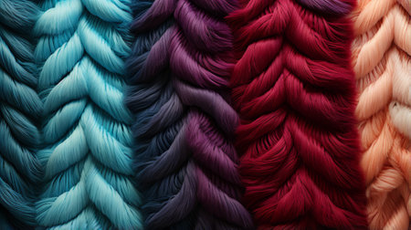 Collection of braided hair strands in various shades of blonde, brown, and black. Close-up texture background. Design for beauty, fashion, hair care, print, banner.