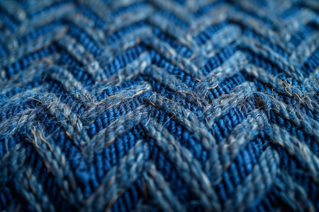 This extreme close-up reveals the intricate woven texture of dark blue fabric. The detailed view showcases the interlaced threads and fibers, highlighting the structure and pattern of the textile. The deep blue color and rough surface create a visually engaging background with a sense of depth and materiality. This macro shot emphasizes the fine details of the woven backgrounds or