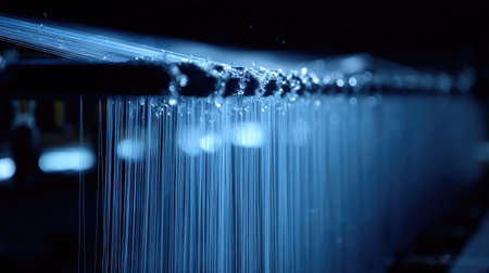 A close-up view captures the intricate details of water droplets on fine threads, creating a beautiful interplay of light and texture in a dark setting.