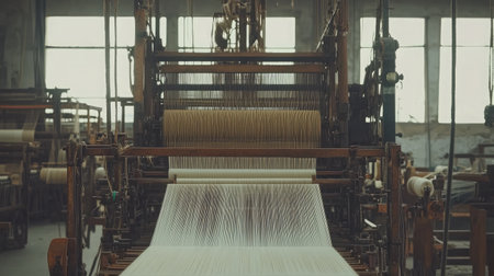 Hands skillfully manipulate threads on a loom, crafting fabric in a rustic workshop bathed in soft, natural light, showcasing traditional techniques.