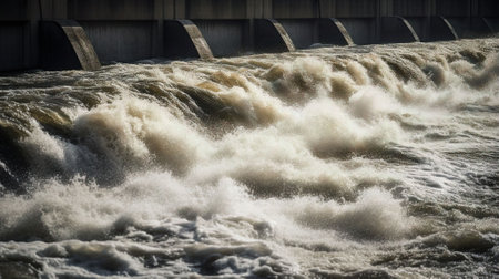 hydroelectric power plant, with the water rushing through the turbines and producing clean energy, created with generative ai