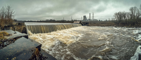 Water rushes over the concrete walls of a dam, creating a powerful flow beneath a somber sky. The distant power station adds an industrial touch to the landscape.