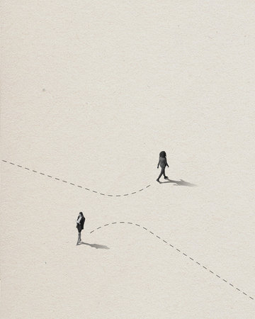 Contemporary art collage with two women going different ways symbolizing misunderstanding, no compromise over light background. Concept of temporary difficulties, challenges, problem, mistakes