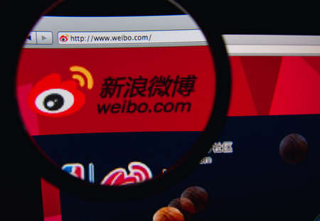 LISBON, PORTUGAL - FEBRUARY 21, 2014: Photo of Sina Weibo homepage on a monitor screen through a magnifying glass.