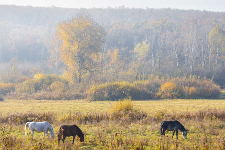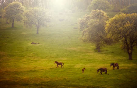 Horses grazing in a meadow in the rays of the rising sun